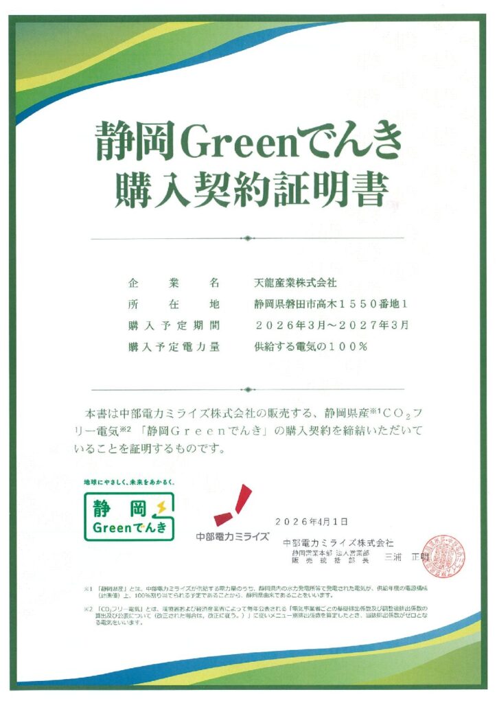 環境負荷低減と持続可能な社会の実現に向けた取り組みの一環として、これまで50%としていた「静岡Greenでんき(※)」の購入比率を、2026年3月より100%へ引き上げました。